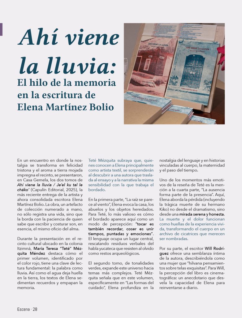 En un encuentro en donde la nostalgia se transforma en felicidad tristona y el aroma a tierra mojada impregna el recinto, se presentaron, en Casa Gemela, los dos tomos de Ahí viene la lluvia / Je’el ku tal le cháko’ (Capulín Editorial, 2025), la más reciente entrega de la artista y ahora consolidada escritora Elena Martínez Bolio. La obra, un artefacto de colección numerado a mano, no sólo registra una vida, sino que la borda con la paciencia de quien sabe que escribir y costurar son, en esencia, el mismo oficio del alma.