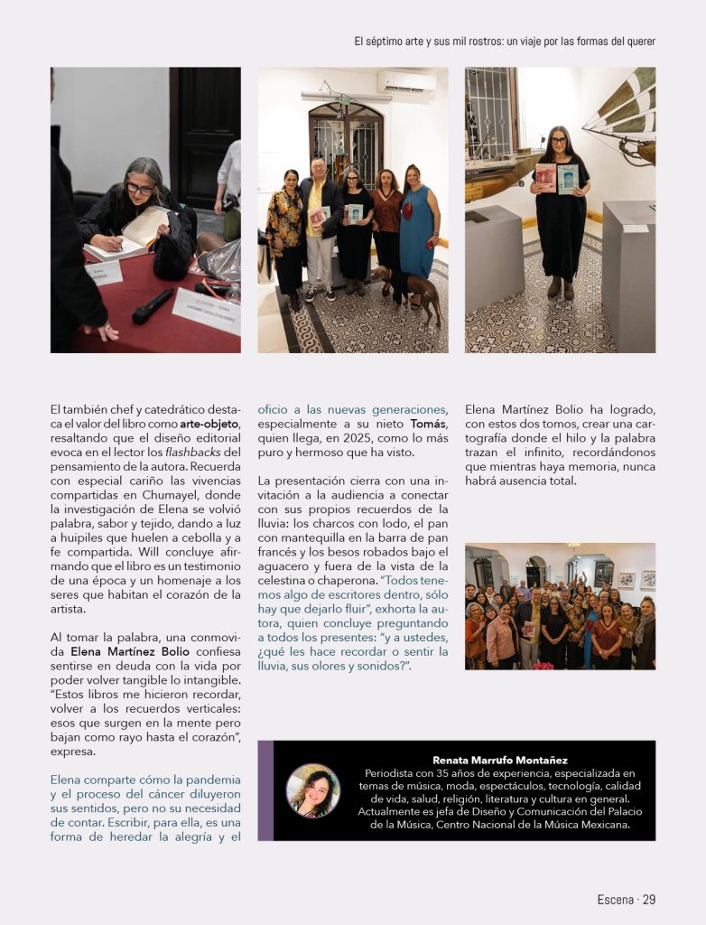 Por su parte, el escritor Will Rodríguez ofrece una semblanza íntima de la autora, describiéndola como una mujer que “hilvana pensamientos sobre telas exquisitas”. Para Will, la percepción del libro es cinematográfica: un anecdotario que desvela la capacidad de Elena para reinventarse a diario.