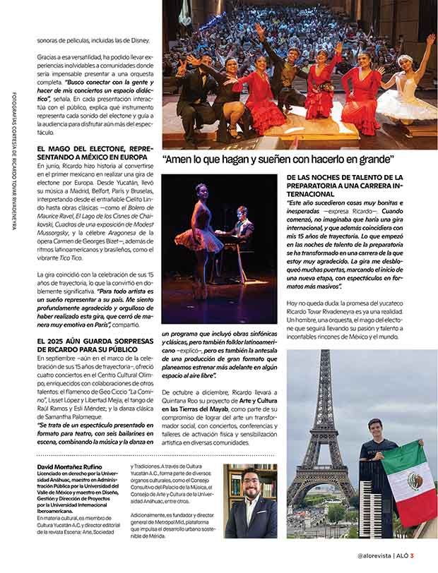En junio, Ricardo hizo historia al convertirse en el primer mexicano en realizar una gira de electone por Europa. Desde Yucatán, llevó su música a Madrid, Belfort, París y Bruselas, interpretando desde el entrañable Cielito Lindo hasta obras clásicas —como el Bolero de Maurice Ravel, El Lago de los Cisnes de Chaikovski, Cuadros de una exposición de Modest Mussorgsky, y la célebre Aragonesa de la ópera Carmen de Georges Bizet—, además de ritmos latinoamericanos y brasileños, como el vibrante Tico Tico.