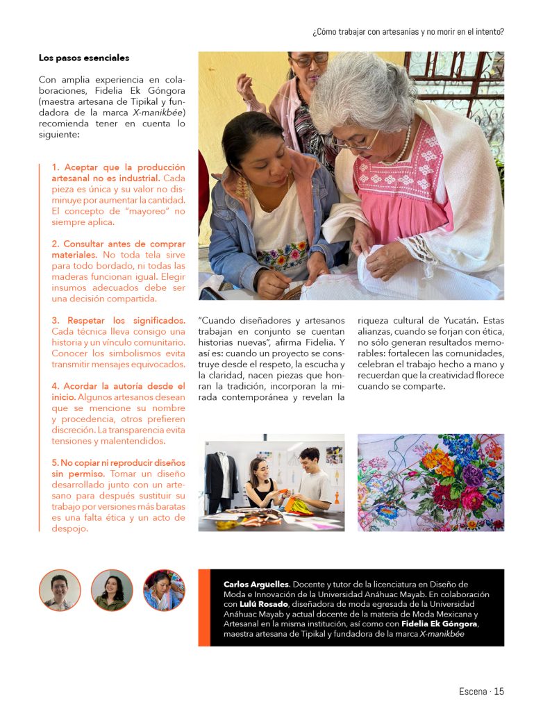 Con amplia experiencia en colaboraciones, Fidelia Ek Góngora (maestra artesana de Tipikal y fundadora de la marca X-manikbée) recomienda tener en cuenta lo siguiente: