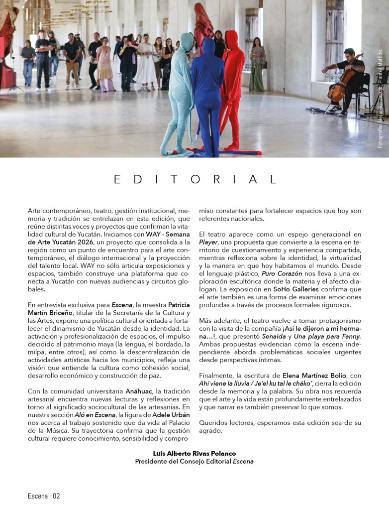Arte contemporáneo, teatro, gestión institucional, memoria y tradición se entrelazan en esta edición, que reúne distintas voces y proyectos que confirman la vitalidad cultural de Yucatán. Iniciamos con WAY – Semana de Arte Yucatán 2026, un proyecto que consolida a la región como un punto de encuentro para el arte contemporáneo, el diálogo internacional y la proyección del talento local. WAY no sólo articula exposiciones y espacios, también construye una plataforma que conecta a Yucatán con nuevas audiencias y circuitos globales.