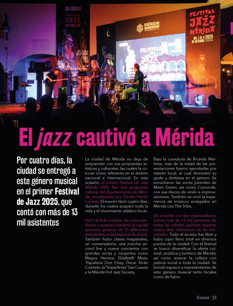 La ciudad de Mérida no deja de sorprender con sus propuestas artísticas y culturales, las cuales la colocan como referente en el ámbito nacional e internacional. En esta ocasión, el primer Festival de Jazz Mérida 2025 fue una propuesta cultural del Ayuntamiento de Mérida, encabezada por Cecilia Patrón Laviada. El evento duró cuatro días, durante los cuales acaparó toda la vida y el movimiento artístico local.