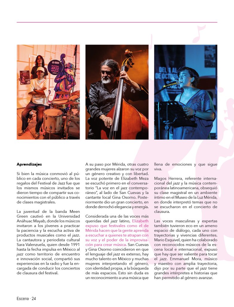 Considerada una de las voces más queridas del jazz latino, Elizabeth expuso que festivales como el de Mérida hacen que la gente aprenda a escuchar a quienes te atrapan con su voz y el poder de la improvisación para crear música. San Cuevas y Gina Osorno coincidieron en que el lenguaje del jazz es extenso, hay mucho talento en México y muchas mujeres interpretando el género, con identidad propia, a la búsqueda de más espacios. Esto sin duda es un reconocimiento a una música que llena de emociones y que sigue viva.