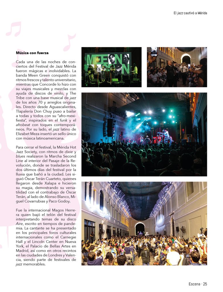 Cada una de las noches de conciertos del Festival de Jazz Mérida fueron mágicas e inolvidables. La banda Meen Green conquistó con ritmos frescos y talento universitario, mientras que Concorde lo hizo con su viajes musicales y mezclas con ayuda de discos de vinilo, y The Tribe con una base musical de jazz de los años 70 y arreglos originales. Directo desde Aguascalientes, Tlapalería Don Chuy puso a bailar a todas y todos con su “afro-mexi-fiesta”, inspirados en el funk y el afrobeat con toques contemporáneos. Por su lado, el jazz latino de Elizabet Meza insertó un sello único con música latinoamericana.