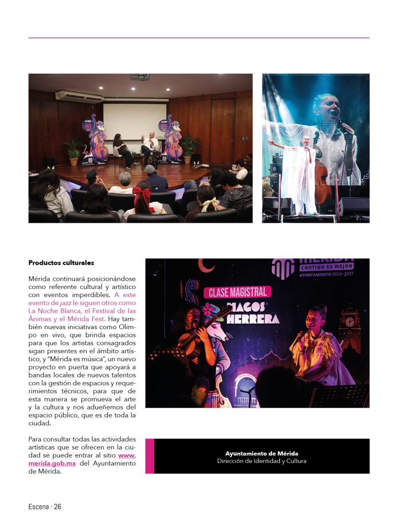 Mérida continuará posicionándose como referente cultural y artístico con eventos imperdibles. A este evento de jazz le siguen otros como La Noche Blanca, el Festival de las Ánimas y el Mérida Fest. Hay también nuevas iniciativas como Olimpo en vivo, que brinda espacios para que los artistas consagrados sigan presentes en el ámbito artístico, y “Mérida es música”, un nuevo proyecto en puerta que apoyará a bandas locales de nuevos talentos con la gestión de espacios y requerimientos técnicos, para que de esta manera se promueva el arte y la cultura y nos adueñemos del espacio público, que es de toda la ciudad.