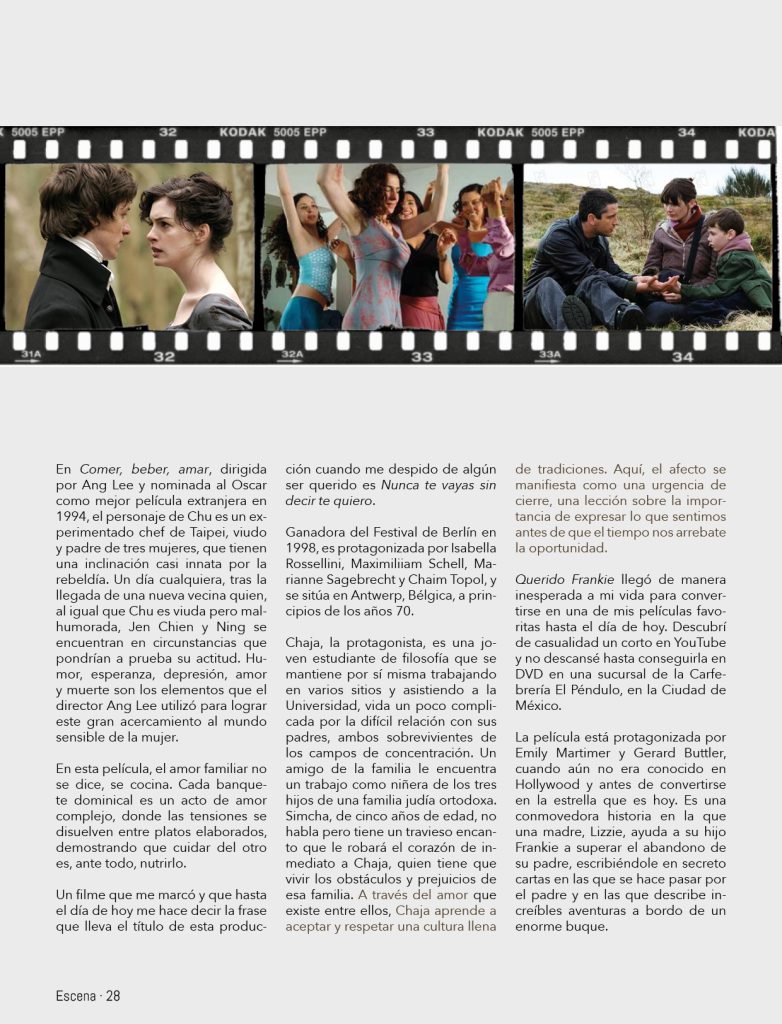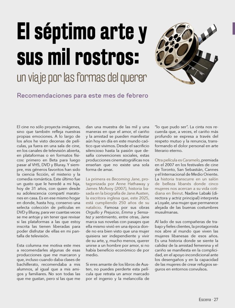 Esta columna me motiva este mes a recomendarles algunas de esas producciones que me marcaron y que, incluso cuando daba clases de bachillerato, recomendaba a mis alumnos, al igual que a mis amigos y familiares. No son todas las que me gustan, pero sí las que me dan una muestra de las mil y una maneras en que el amor, el cariño y la amistad se pueden manifestar aún hoy en día en este mundo caótico que vivimos. Desde el sacrificio silencioso hasta la pasión que desafía convenciones sociales, estas producciones cinematográficas nos enseñan que no existe una sola forma de amar.
