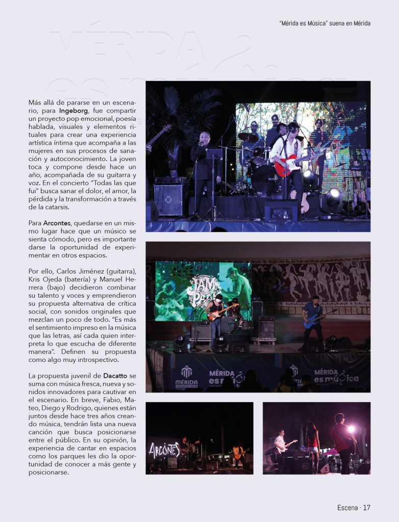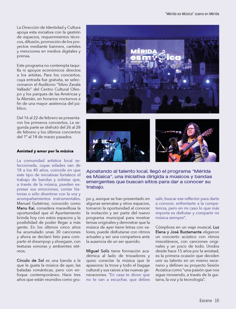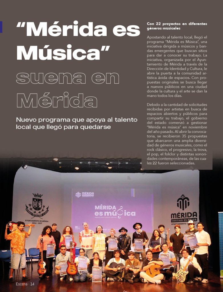 Apostando al talento local, llegó el programa “Mérida es Música”, una iniciativa dirigida a músicos y bandas emergentes que buscan sitios para dar a conocer su trabajo. La iniciativa, organizada por el Ayuntamiento de Mérida a través de la Dirección de Identidad y Cultura, le abre la puerta a la comunidad artística ávida de espacios. Con propuestas originales se busca llegar a nuevos públicos en una ciudad donde la cultura y el arte se dan la mano todos los días.