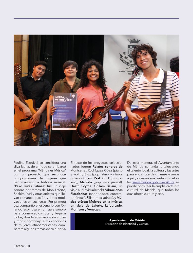 Paulina Esquivel se considera una diva latina, de ahí que se embarcó en el programa “Mérida es Música” con un proyecto que reconoce composiciones de mujeres que han marcado la historia musical. “Paw: Divas Latinas” fue un viaje sonoro por temas de Mon Laferte, Shakira, Yuri y otras artistas que llevan romance, pasión y otras motivaciones en sus letras. Por primera vez compartió el escenario con Orlando Espinosa en un viaje sonoro para conmover, disfrutar y llegar a todos, donde además de divertirse y rendir homenaje a las canciones de mujeres latinoamericanas, compartirá algunos temas de su autoría.