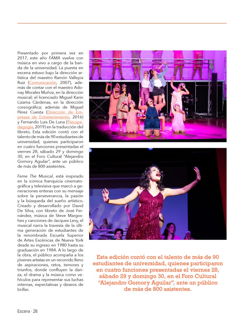 Presentado por primera vez en 2017, este año FAMA vuelve con música en vivo a cargo de la banda de la universidad. La puesta en escena estuvo bajo la dirección artística del maestro Ramón Vallejos Ruiz (Comunicación, 2007), además de contar con el maestro Adonay Morales Muñoz, en la dirección musical; el licenciado Miguel Karin Lizama Cárdenas, en la dirección coreográfica; además de Miguel Pérez Cuesta (Dirección de Empresas de Entretenimiento, 2016) y Fernando Luis De Luna (Psicopedagogía, 2019) en la traducción del libreto. Esta edición contó con el talento de más de 90 estudiantes de universidad, quienes participaron en cuatro funciones presentadas el viernes 28, sábado 29 y domingo 30, en el Foro Cultural “Alejandro Gomory Aguilar”, ante un público de más de 800 asistentes.