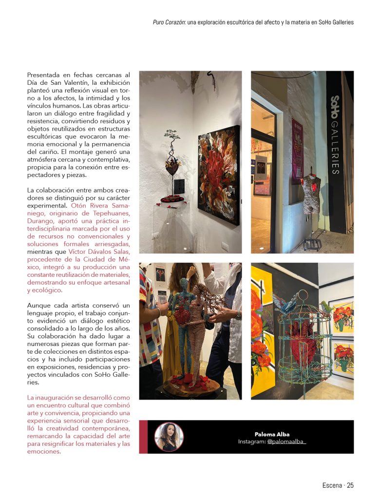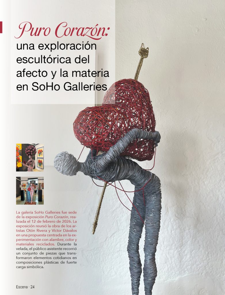 La galería SoHo Galleries fue sede de la exposición Puro Corazón, realizada el 12 de febrero de 2026. La exposición reunió la obra de los artistas Otón Rivera y Víctor Dávalos en una propuesta centrada en la experimentación con alambre, color y materiales reciclados. Durante la velada, el público asistente recorrió un conjunto de piezas que transformaron elementos cotidianos en composiciones plásticas de fuerte carga simbólica.